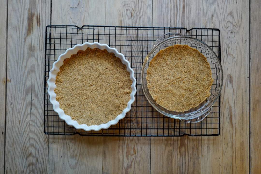 - Knus kjeks i blender. Kok opp smør og brunsukker og hell i smulene. Ha dette over i en paiform og press det på plass. Stek i forvarmet ovn på 180 grader i ti minutter. Ta ut formen.