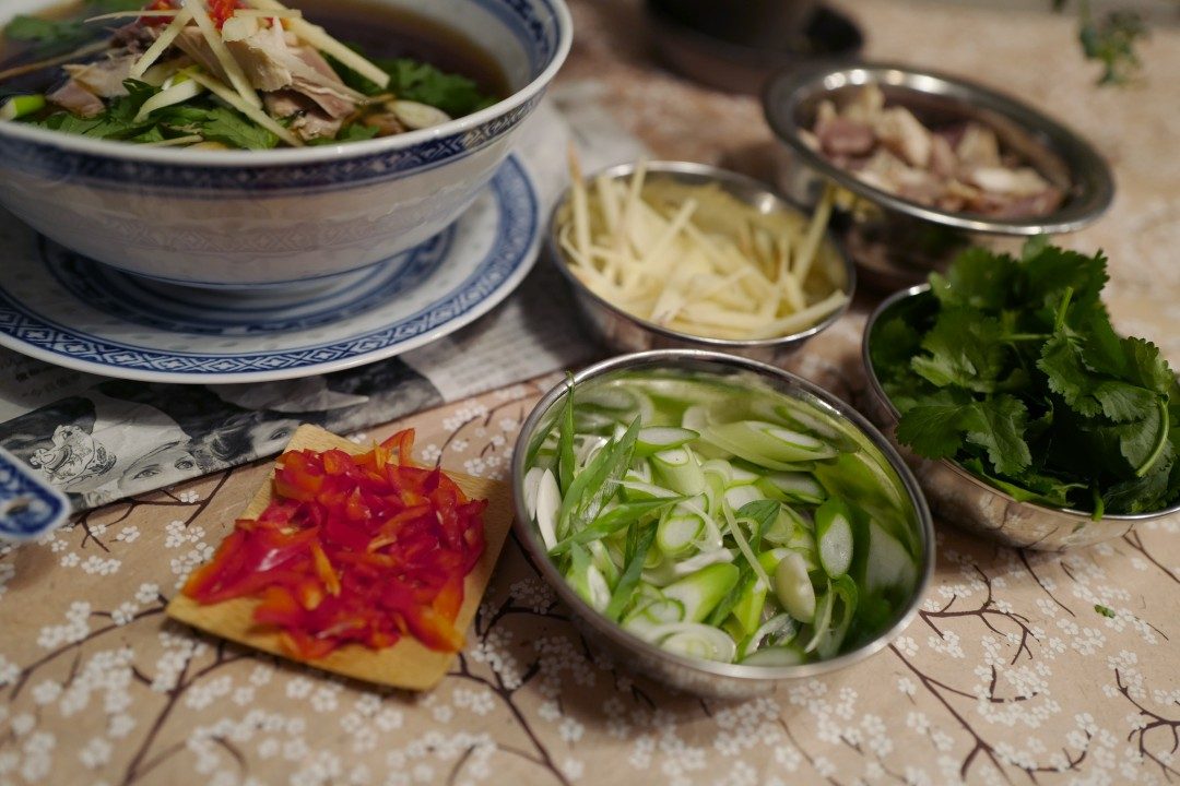 Skjær tynne strimler av rå ingefær. Grovhakk rød chili. Snitt vårløk. Server dette og frisk koriander til suppen. Bruk litt av det deilige hønsekjøttet i suppen, men spar det meste til neste dag. Da skal det nemlig lages nok en herlig rett med høne.