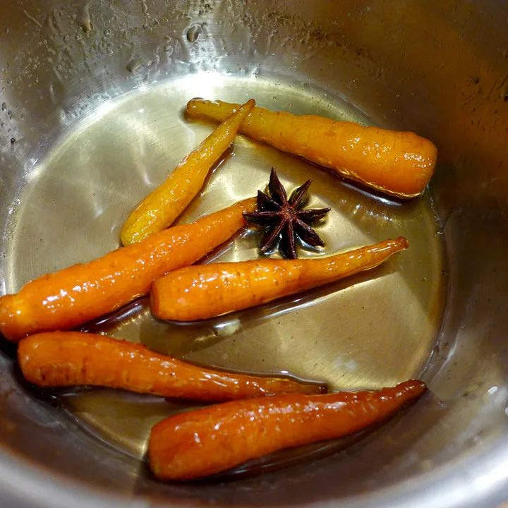 Så fyller du 1 dl vann i en kjele med 3ss honning og 1 hel stjerneanis. La dette småkoke til væsken er nesten kokt inn og gulrøttene er deilig «skrukkete».