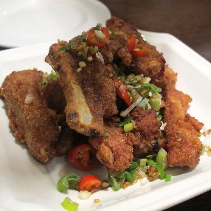 Vi bestiller chili ribs og crispy duck og avkjølt kalifornisk chardonnay i flaske.