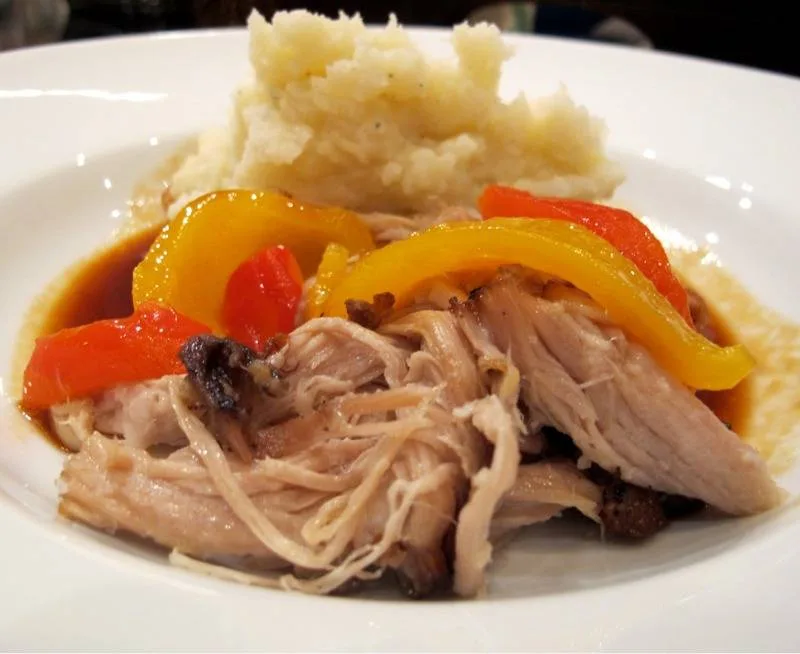 Lag en enkel potetmos, legg på kjøttet og paprikastrimler. Hell over litt av den smaksrike sausen rundt.