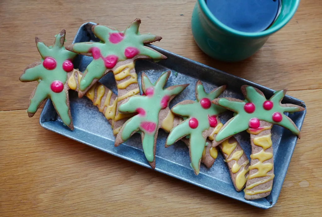 Mine julekaker blir i år litt annerledes enn pepperkakehjerter. Jeg har laget fargerike kjeks med kaffe og kakao. På Hawaii er det vanlig å bruke begge disse ingrediensene i matlaging. Ikke så rart med tanke på at de dyrker både kakao og kaffe på øyene.