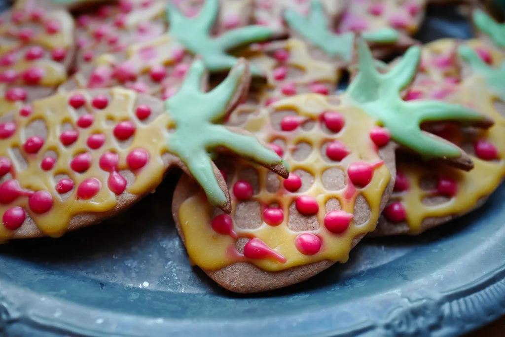 Vent til kakene er helt avkjølt med å pynte dem. Du lager glasur ved å blande melis, konditorfarge og vann. Jeg har byttet ut vannet med 50% sitronsaft og 50% vann. Det gir god smak og friskhet til kakene. Lag glasuren fast nok slik at den ikke sklir ut.
