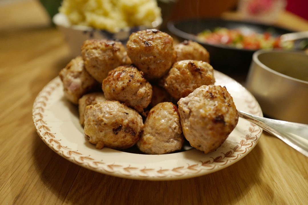 Erik, mannen min, er kjøttbollemester her i huset. Og han mestrer det med glans! Han lager forskjellige versjoner og denne var helt ny. Kanskje min favoritt så langt, faktisk. De inneholder svinekjøttdeig og bacon. Hallo! Det er jo bare den perfekte kombinasjonen. Serverer du disse med potetstappe har du en vinner.