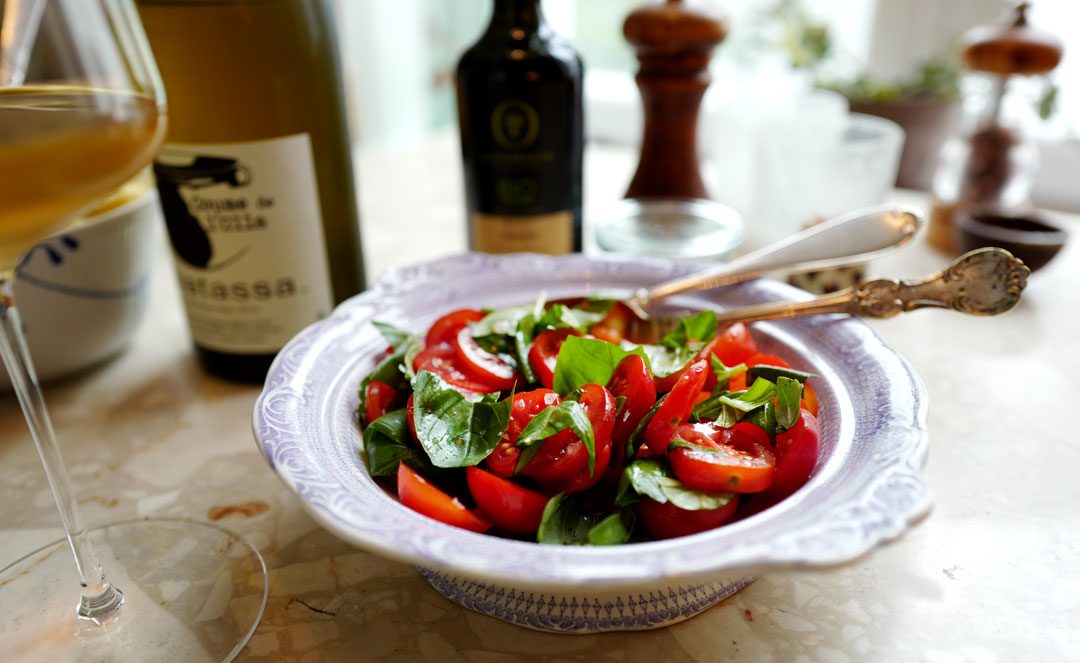 Server med deilige tomater med masse basilikum, olivenolje, flaksalt og litt sitronsaft.