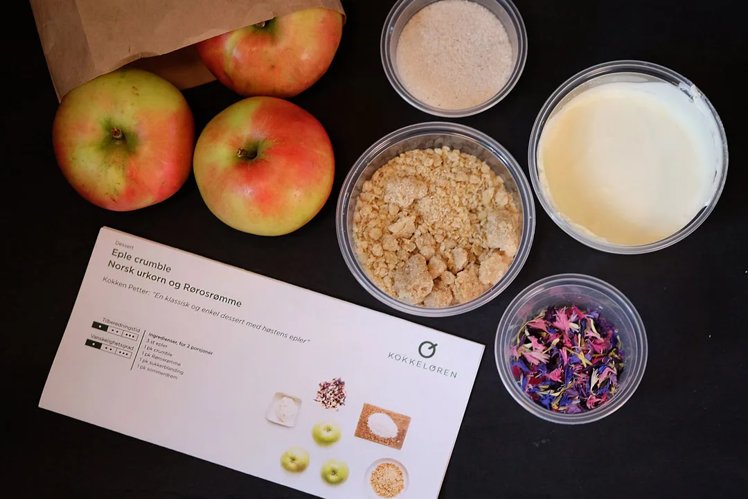 Retten er superenkel å lage og sukkerblandingen som følger med inneholder varme og deilige krydder. Du steker eplebiter med denne sukkerblandingen, legger dem over i en ildfast form og strør crumble over, som Kokkelørens kokker har laget av urkorn, rørossmør og krydder. Retten skal inn i ovnen under grillen i 6 minutter. Når eplecrumblen er klar, serveres den sammens med rørosrømme og tørkede blomster til pynt. Den var aldeles smakfull og nydelig. Lett å lage og en drøm å spise.
