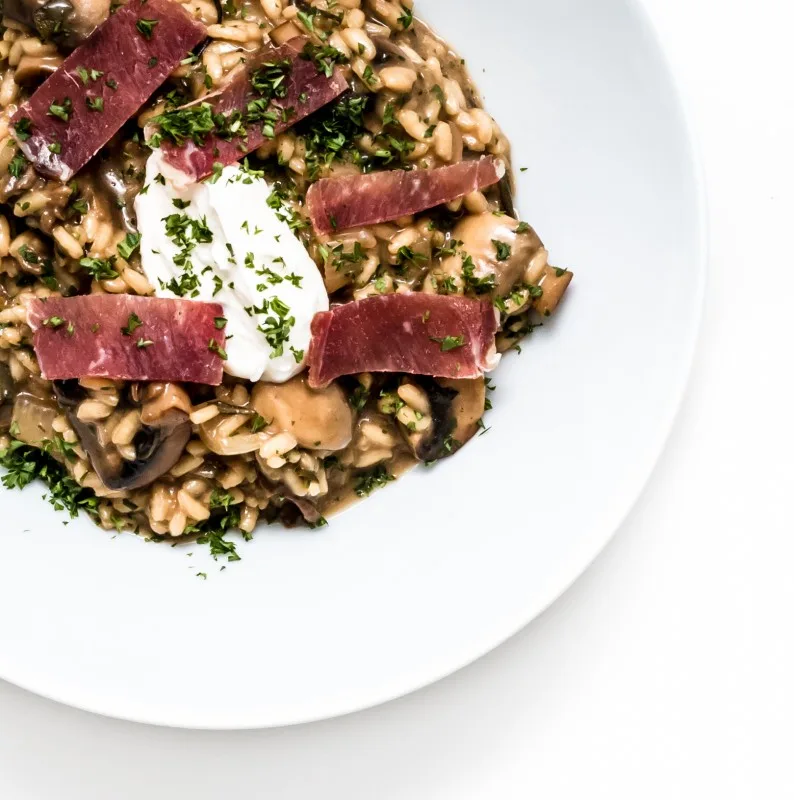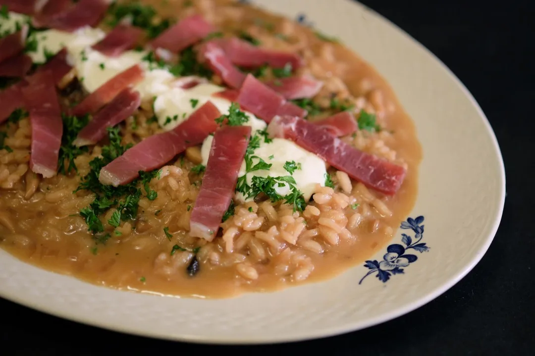 Sjampinjongene skal skjæres opp. Løken hakkes. Fenalår fra Hogna (nydelig fenalår, forresten!) skjæres i skiver og legges til side. Det samme gjør vi med persillen. Kokkelørens egen soppkraft smaker vidunderlig. Den minner om en kinesisk masterstock og er laget på steinsopp. Masse smak. Retten står beskrevet som enkel å lage, men jeg synes aldri risotto er en enkel rett å lage. Jeg lager masse risotto, og er ganske god til det, men for noen som aldri har laget det før, kan det virke som en vanskeligere oppgave. Skal jeg utsette en ting på fremgangmåten må det være at den er litt mangelfull. En liten antydning på ca hvor lang tid retten tar å lage hadde vært en fin pekepinn, men ellers er det fint forklart om hvordan konsistensen på risen skal være. Når risotto-risen er ferdigkokt i kraft, sopp og løk, tilsetter vi rørossmør (i rikelige mengder) og revet ost. Her brukes ikke parmesanost slik jeg er vant til, men «Høvding Sverre», en kittost fra Orkladal ysteri. Den er rund og deilig og demper saltsmaken fra rørossmøret. Når risottoen nå er montert sammen, drysser vi persille over og pynter med Nýr (Nýr produseres av syrnet, økologisk, helmelk) og de deilige fenalårskivene.