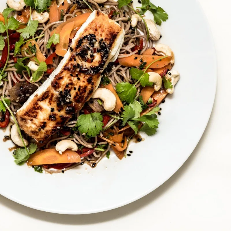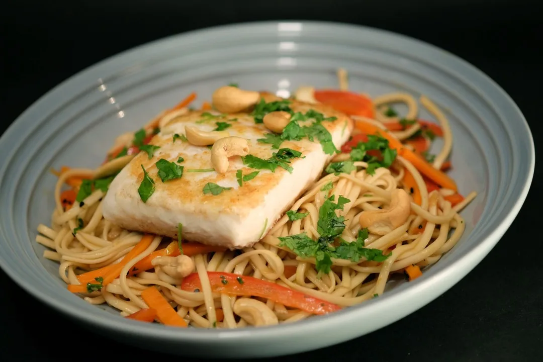 Neste rett er Pannestekt Sterlingkveite med sobanudler, chili og honning fra Toten (kr 165 per porsjon)