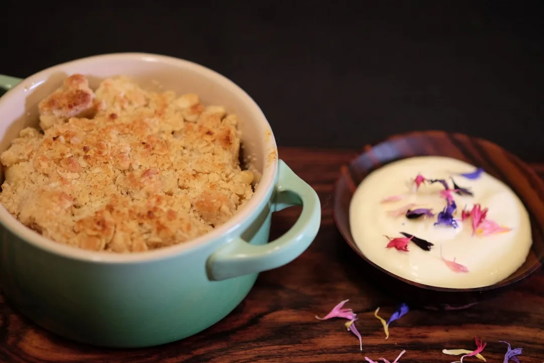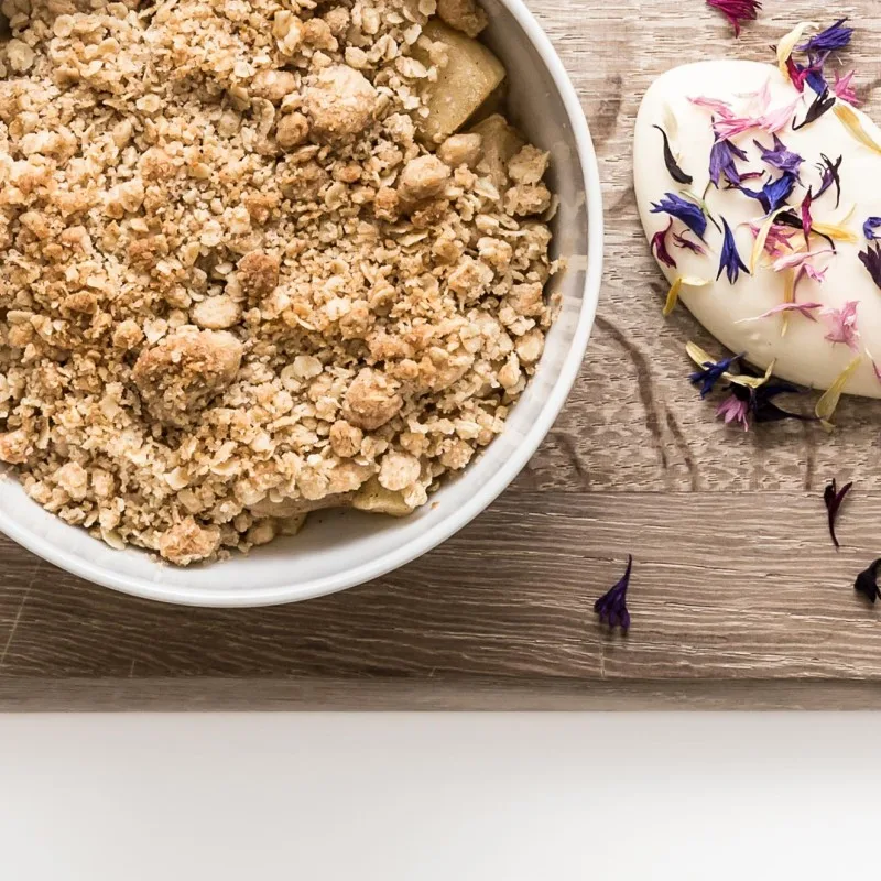 Eple Crumble laget på norsk urkorn og rørosrømme (Kr 59 per porsjon):