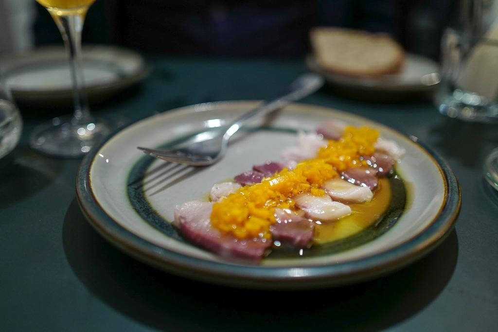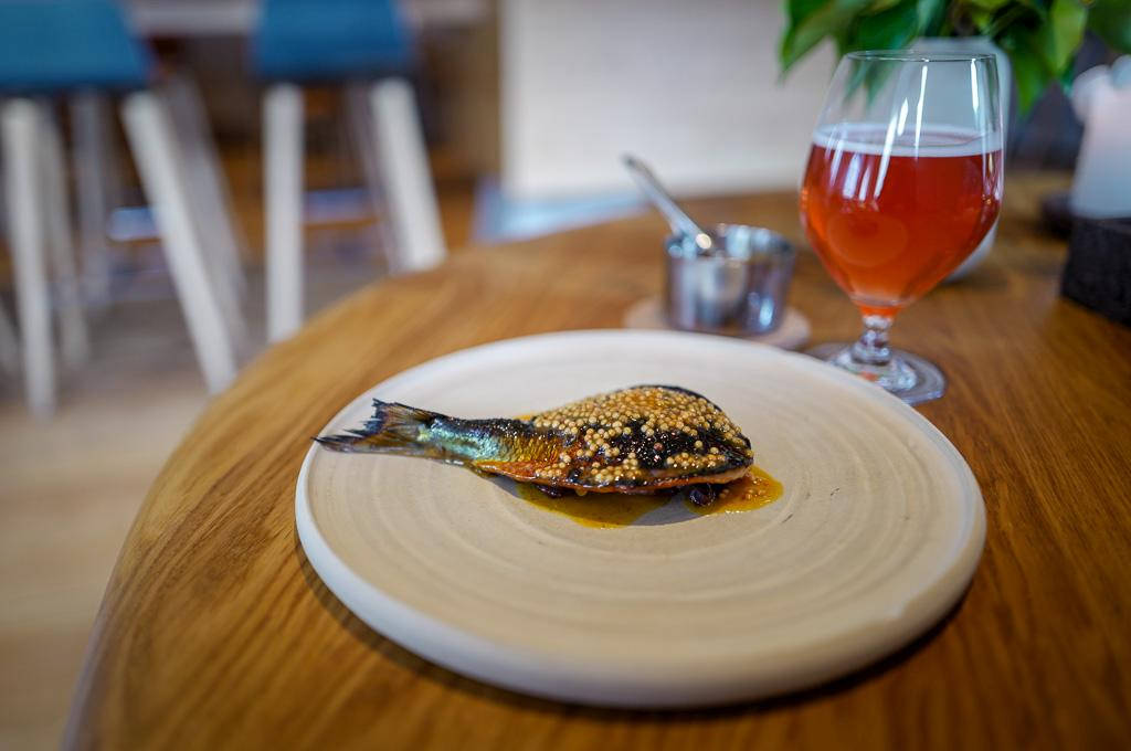 Jeg bestiller en herlig varmrøkt sild med rabarbra og plomme, brunet smør og sennepsfrø. Nydelig!