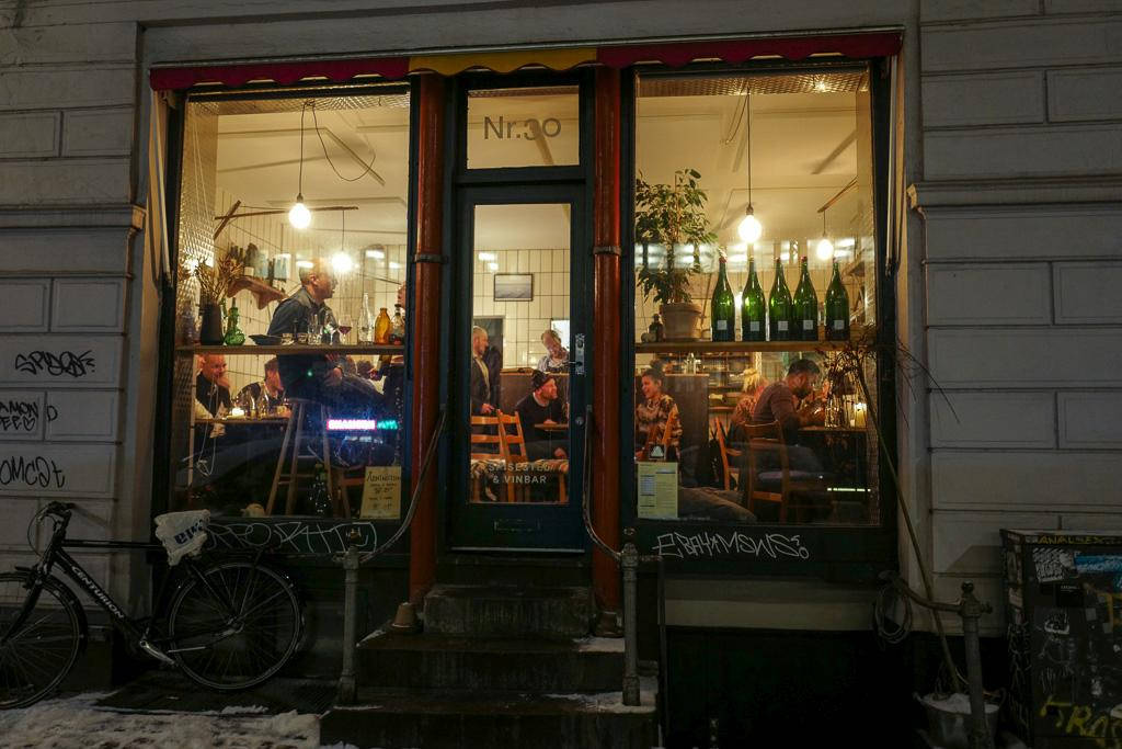 Nansensgade 30 er vinbaren med stor V. Avslappet, utrolig hyggelig betjening og et fantastisk utvalg av småretter og vin. Vi snakker igjen om naturvin. København er en utrolig bra by for å prøve deilige viner i den sjangeren.