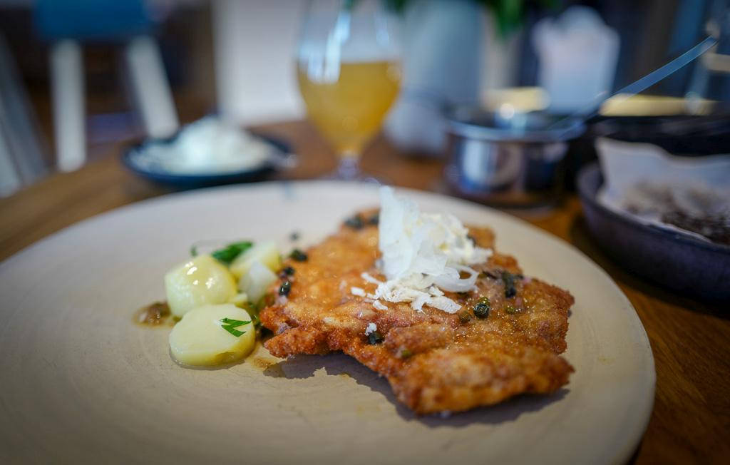 Dette er en av Restaurant Barrs signaturretter: Svinesnitzel med pepperrotkrem og ansjossmør. Så saftig. Så eventyrlig godt.