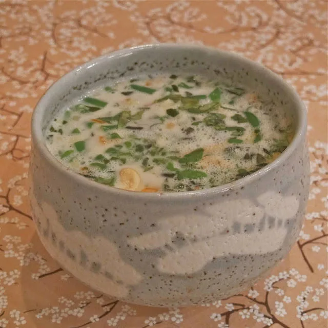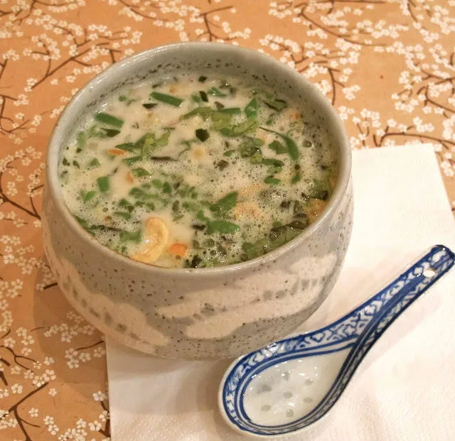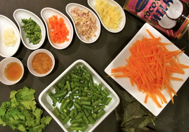 | Her er ingrediensene: 1 ts ferskpresset hvitløk 1 ss hakket kaffirlimeblader 1/2 sterk chili, finhakket 1 sitrongress, hakket (kun den hvite nederste delen på gresset) 2 ss revet ingefær 2 ss fiskesaus 1 ss sukker. Jeg brukte kokossukker revet økologisk gulrot (for de har søtest smak, synes jeg), revet eller skålet fint i strimler aspargesbønner i biter 1 boks kokosmelk frisk koriander frisk thaibasilikum1 neve cashewnøtter ristes i en tørr panne.Varm kokosmelken i en gryte og tilsett alle ingrediensene unntatt koriander, basilikum og gulrot. La trekke opp mot kokepunktet i 10 minutter. I en skål legger du hakkede urter, nøtter og gulrot. Hell suppen over.Har du tørket kokos i skapet kan du riste litt i en tørr panne og blande i suppen for å få en fyldigere og mer mettende konsistens. Enkelt, ikke sant? |