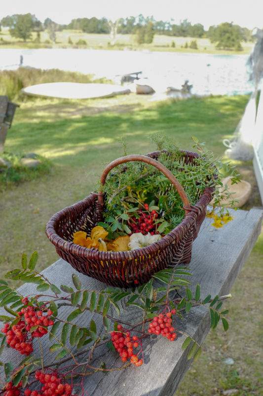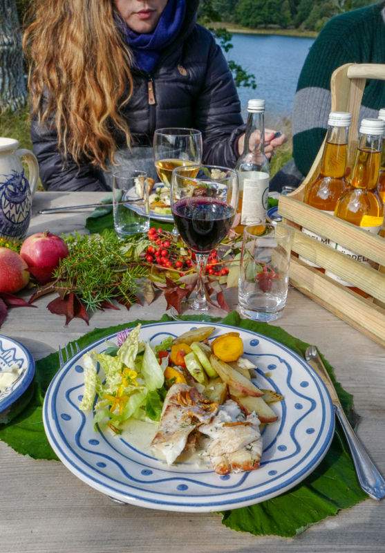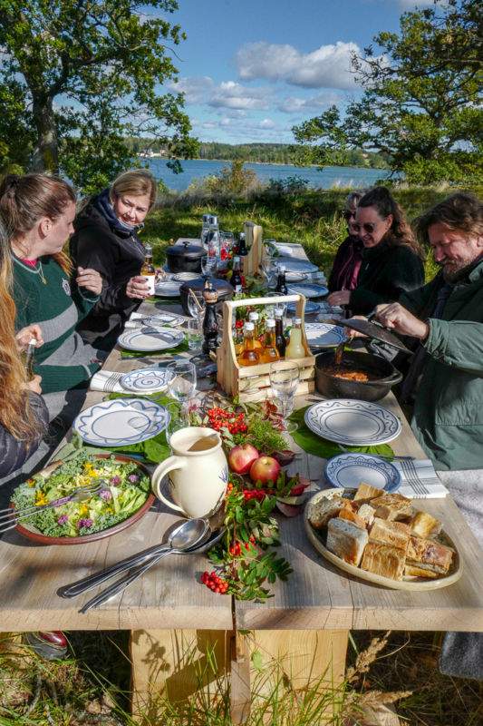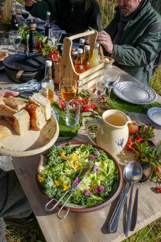Vi går ned mot innsjøen der Tina Sandberg venter på oss. Hun skal tilberede lunsjen sammen med oss. Ved ildstedet står det kopper og kar. På toppen av en liten knaus like ved er det dekket opp til festmåltid med høstens knallfarger fra naturen.