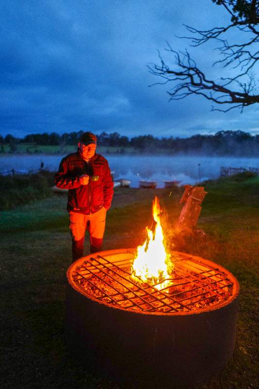 Vi møter fisker Jonas (pappaen til Viktor) ved bålet der vi får en kopp kaffe. Det damper av innsjøen. Stemningen er trolsk og dagslyset begynner å titte frem.