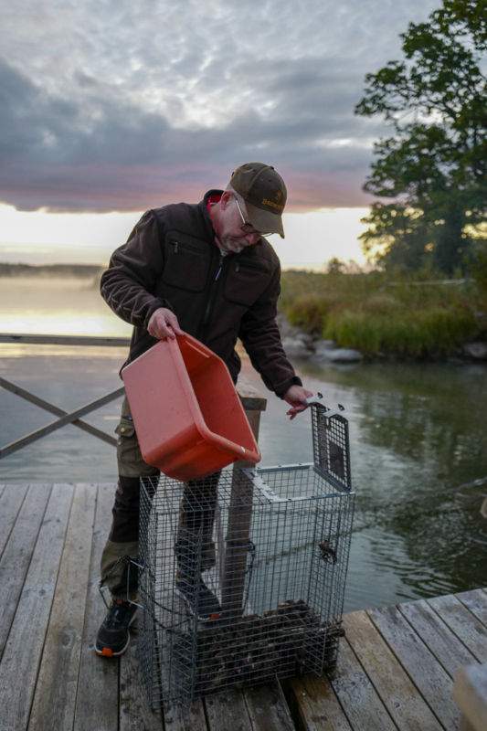 Før middag skal vi sette krepseteiner. Vi møter Viktor og hans lille hjerteknuser, Dante.
