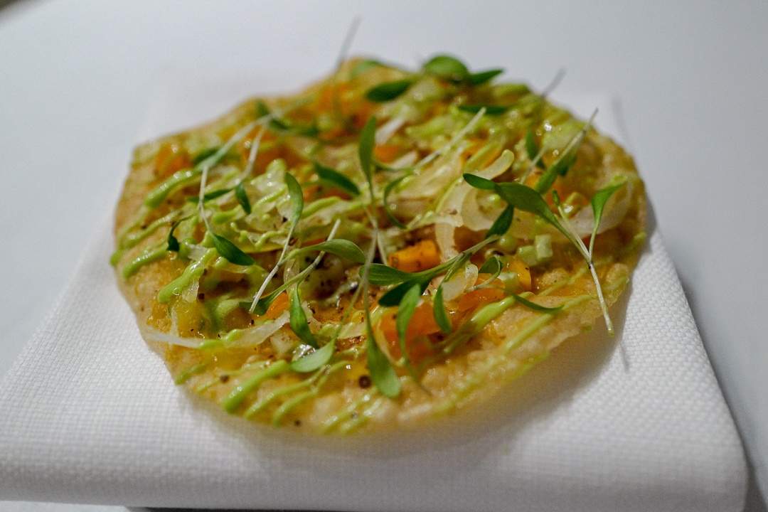 Vi starter med et glass rosa champagne og en papadum laget på Ølandshvete med mangochutney, syltet lime. saltet løk, dressing laget av mynteolje og crème fraîche, agurk og korianderskudd. Dette er snacken du egentlig vil ha et dusin av. En fantastisk smaksbombe som setter en deilig standard for hva vi har i vente.