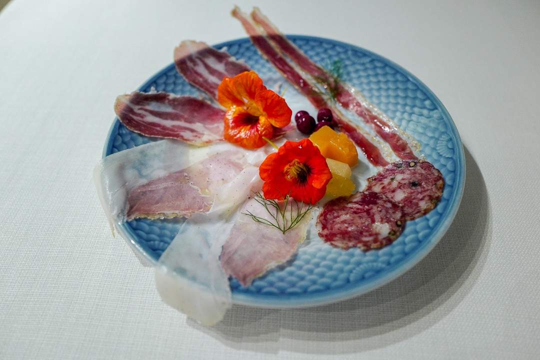 Neste smårett er en tallerken med Charcuterie. Her er det salami med sort og grønn pepper, skinke av ryggfilet og nakkefilet, tørket og saltet and, syltet gresskar, tranebær og blomkarse. Jeg mistenker at det er helt litt hasselnøttolje over spekematen og det gir en deilig smak til kjøttet.