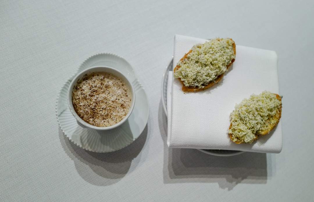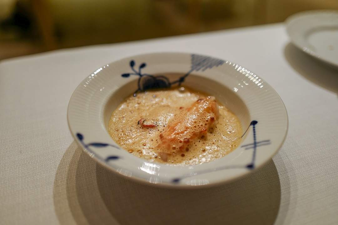 Retten er en tykk og intens soppsuppe med soppskum og tørket soppulver. Til suppen fikk vi en crouton med den klassiske, danske blåmuggosten «Blå kornblomst» . Kombinasjonen er unik: Intens, dyp og varmende.