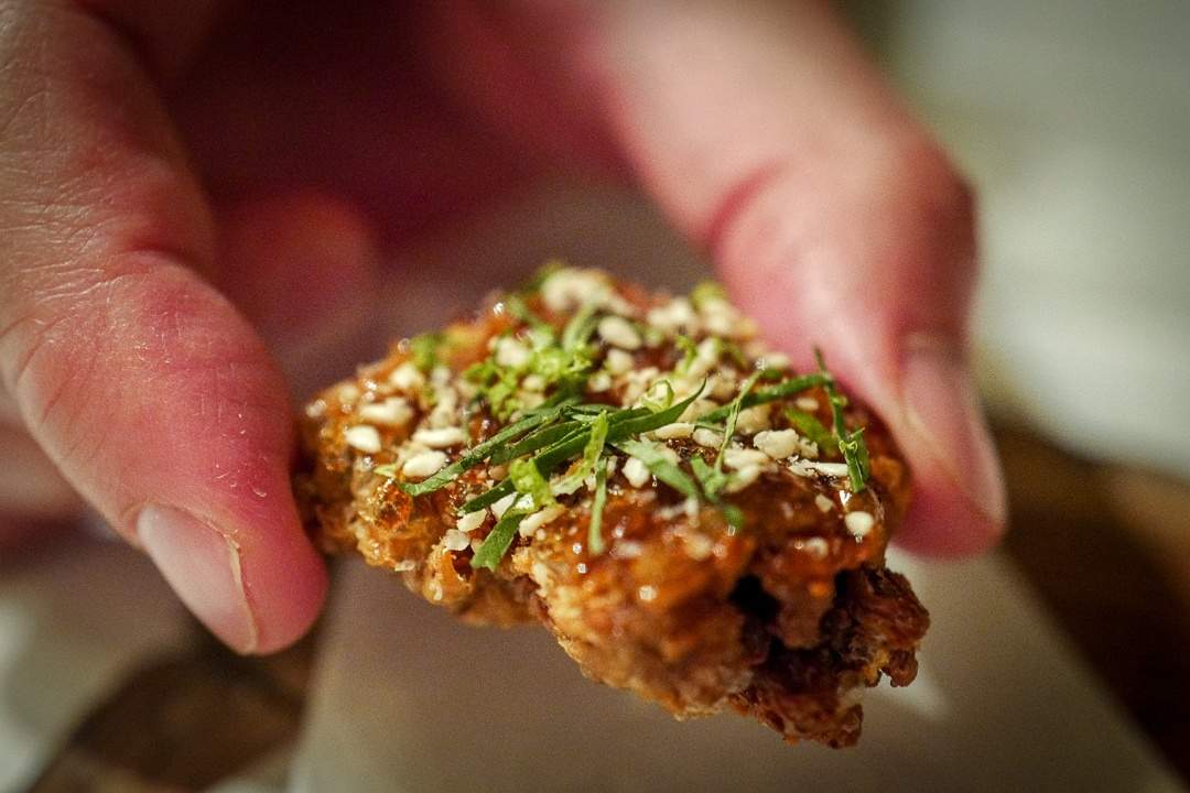 Vi får en snack til og den minner om en koreansk rett jeg fikk på en moderne gastropub i Seoul, nemlig en fritert, utbenet andevinge med asiatiske smaker og sesam på toppen. Nam!