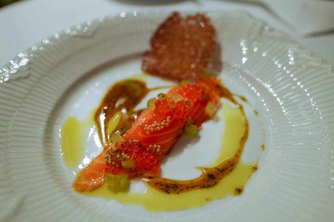 Paul overrasker med en rimelig klassisk rett etter en sekvens med masse deilige snacks. Vi får en tallerken med gravlaks med rævesauce (en ganske søt sennepssaus som er klassisk dansk) med sennepsfrø, pepperot, agurk, lakserogn og rugbrød. Deilig dansk og totalt uventet å få på en Michelinrestaurant. Dog en positiv overraskelse fordi Paul lager ærlig mat der man kan se og smake alle ingrediensene.
