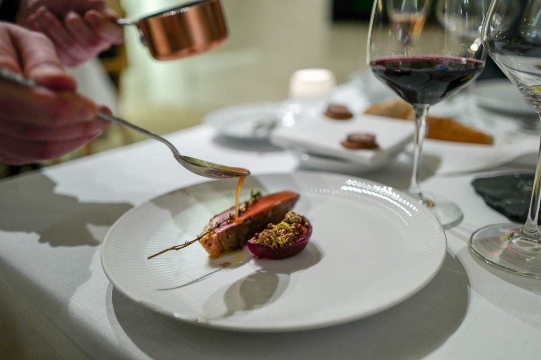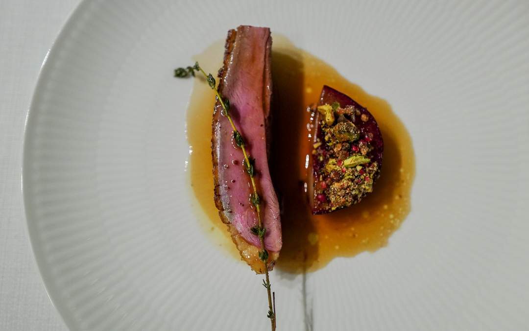 Hovedretten er et deilig stykke and med grillet plomme med et deilig dryss dukkah laget av rosépepper og korianderfrø. Vi får også en ingefærkjeks med andeterrin til. Det er enkelt, lekkert og presist. Det er tøft når man får servert en rett med få ingredienser og man føler at man allikevel har fått en komplett rett.