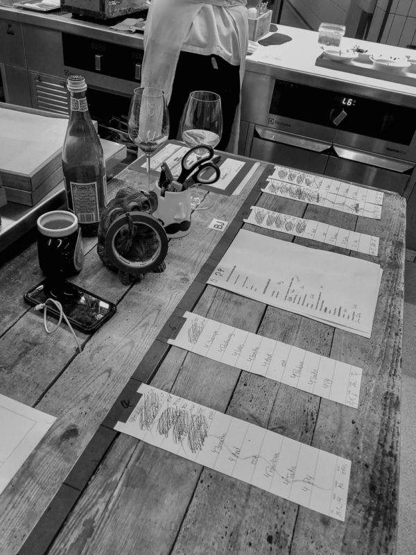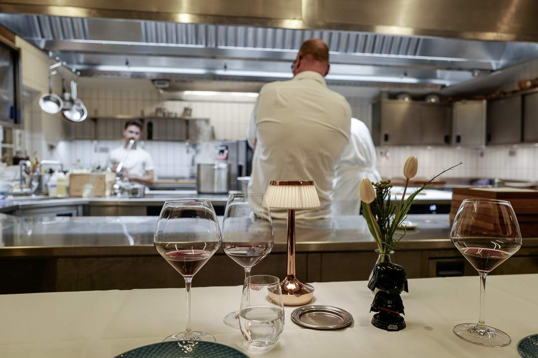 Vi blir ført inn i kjøkkenet og til det eneste bordet som står der. Britisk musikk spilles høyt, det er god stemning og vi få vin i glasset. Med et glemmer vi at vi er på restaurant. Det føles heller som det aller beste nachspielet med verdens beste matservering.