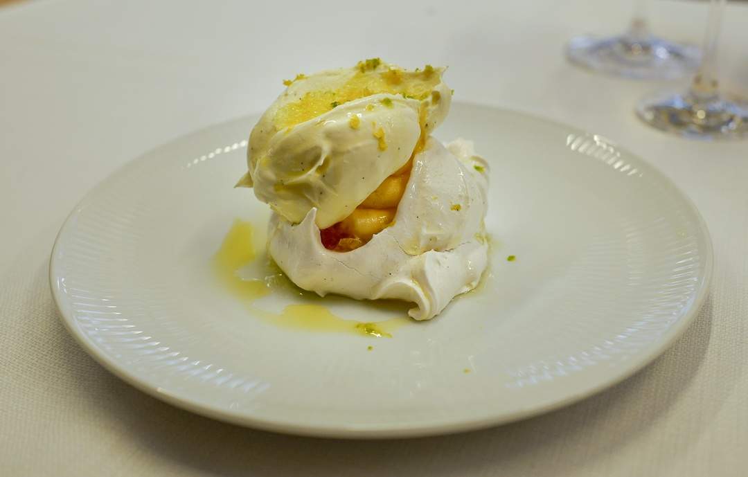 Desserten kommer på bordet. Det er en deilig pavlova fylt med lettfrossen sitruskrem, mandarinsorbet, yuzu, lettpisket krem, amalfisitroner og fingerlime. Olivenolje på toppen bryter den deilige syrligheten i retten. En fantastisk deilig og frisk dessert.