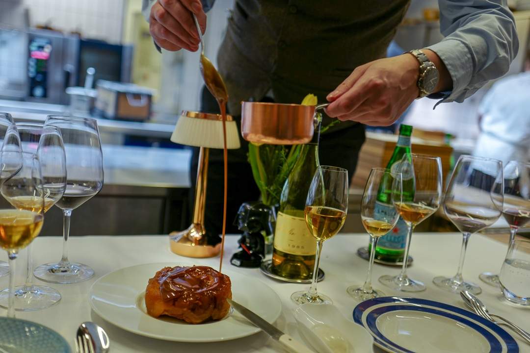 Men det stopper ikke der. De har faktisk tenkt å ta livet av oss og serverer oss derfor en dessert til – i ekstra stor porsjon. Vi får en hel tarte tartin laget på fynske epler og calvados med en lekker karamellsaus.