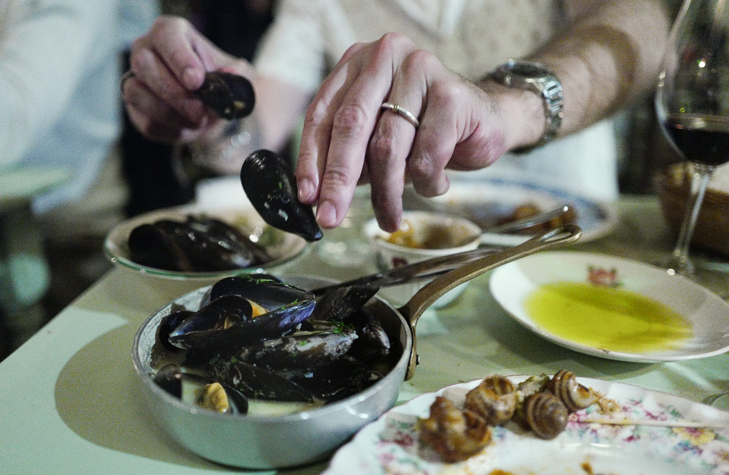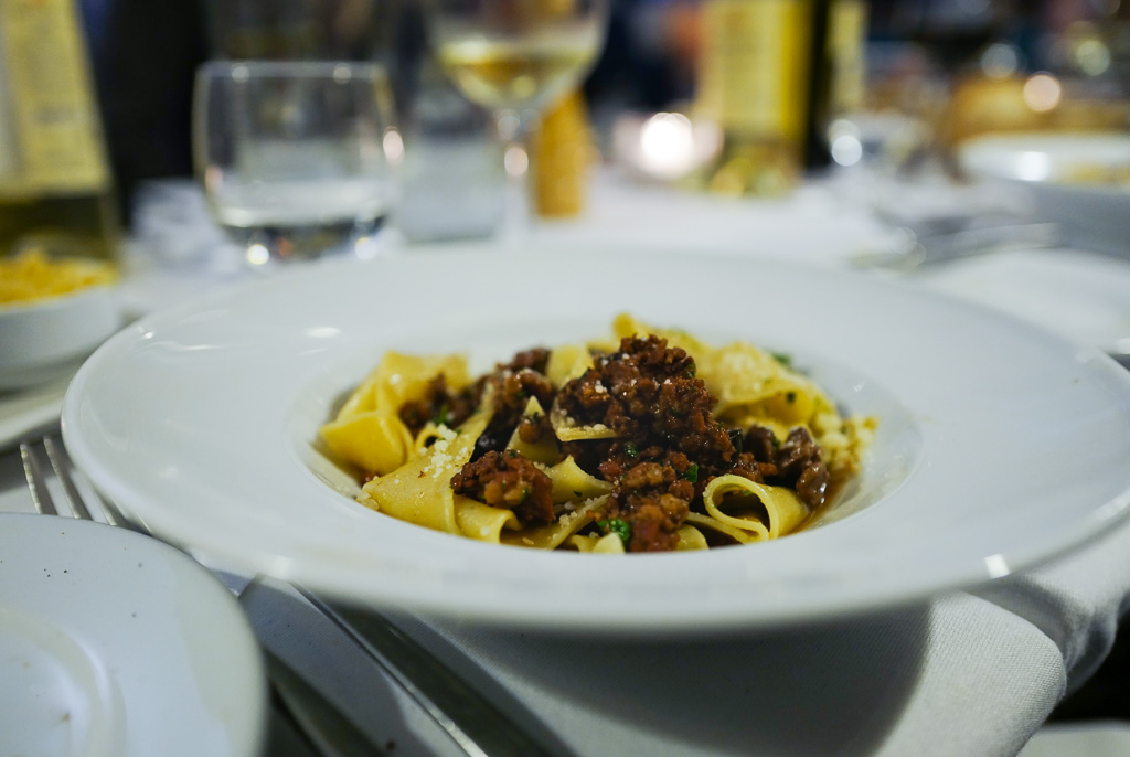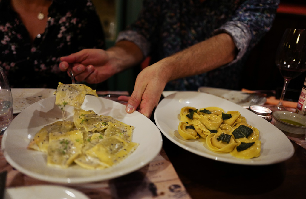 Cent’Anni er et utrolig trivelig spisested. Vi får nybakt brød med olivenolje til. Det kommer paster med smørbønner og oliven inn på bordet. Vi får friterte fiskeboller, laks med kapers, blekksprut, villsvinravioli og ravioli med gresskar og muskatnøtt. Vi får pølser med karamellisert løk, and og daddelfritter. Maten er fantastisk og alle retter kommer inn som deleretter.
