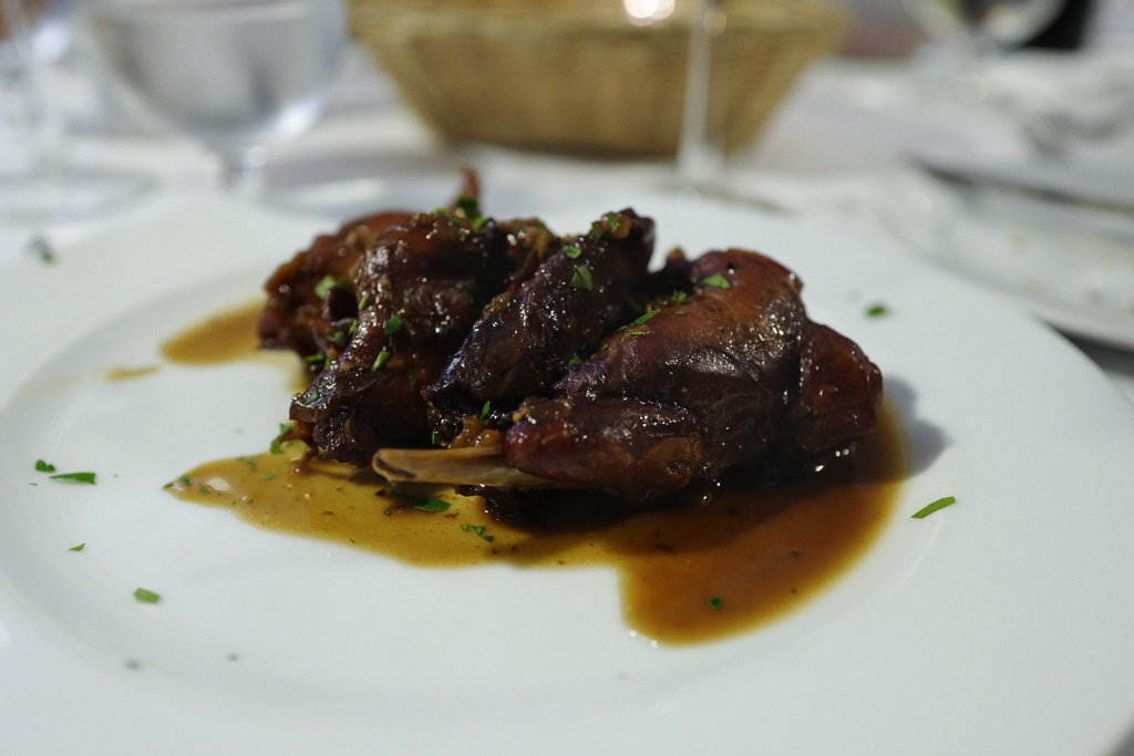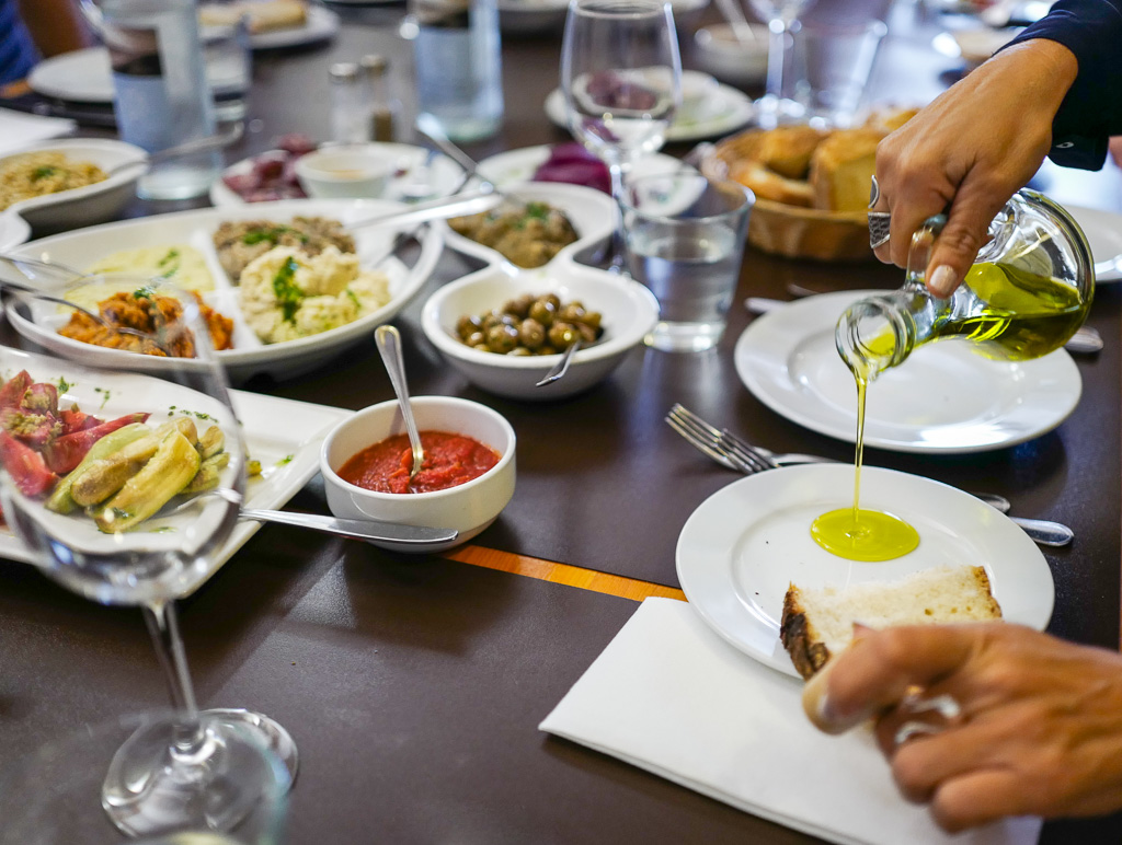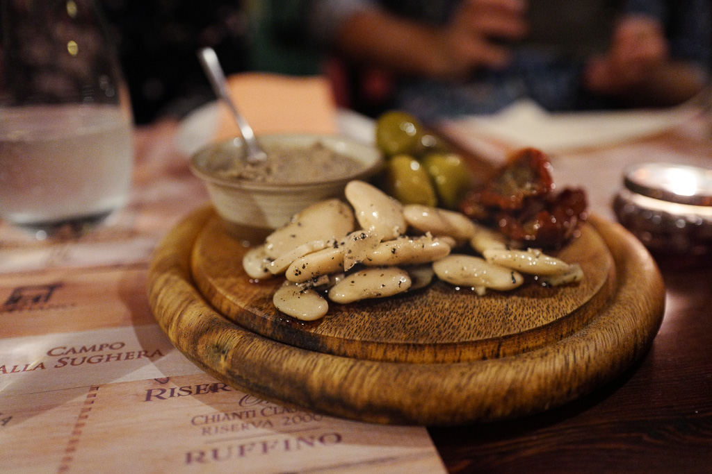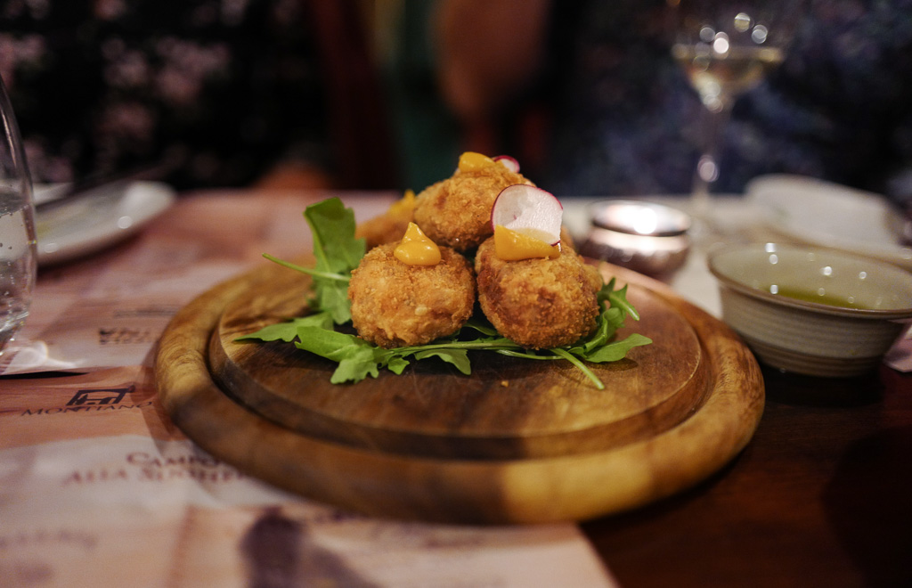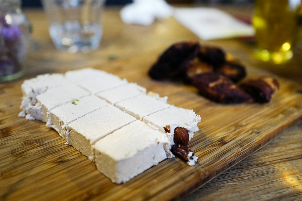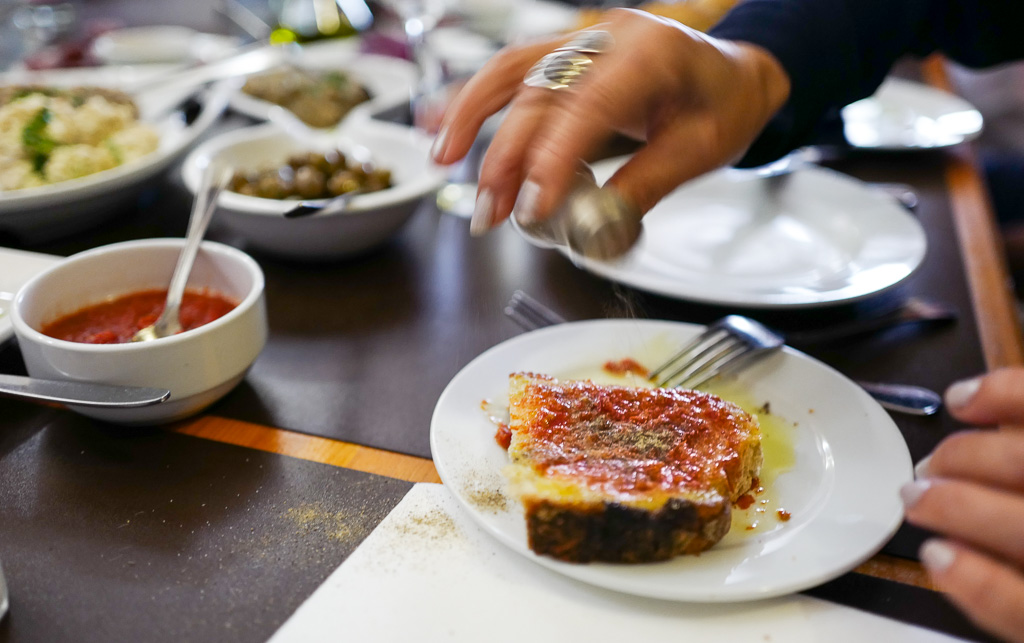 Vi får servert et bredt utvalg av fristende petut – småretter som grønnsaker, dipper, det lokale brødet med deilig, sprø skorpe, oliven lagt ned på honning og chili, ravioli, konfitert hanehals fylt med okse- og svinekjøtt.