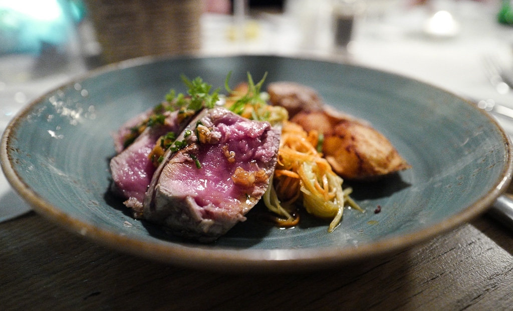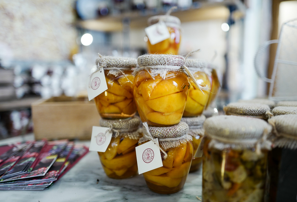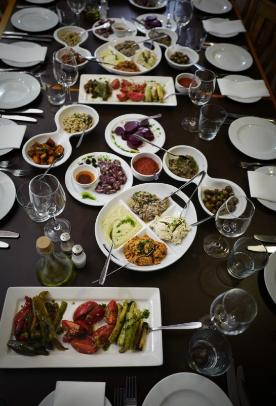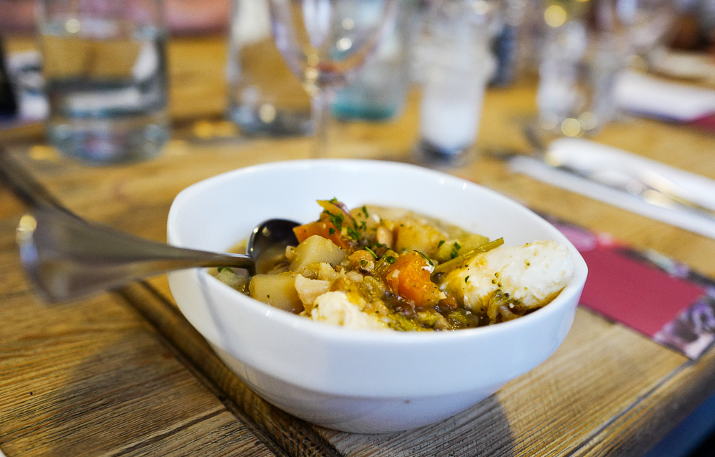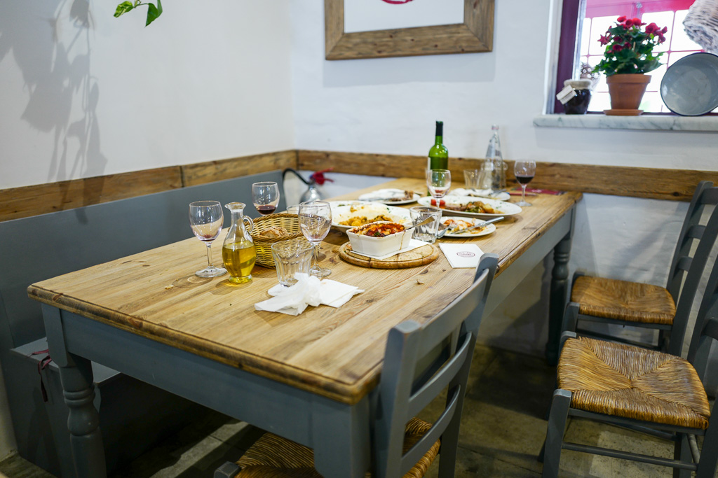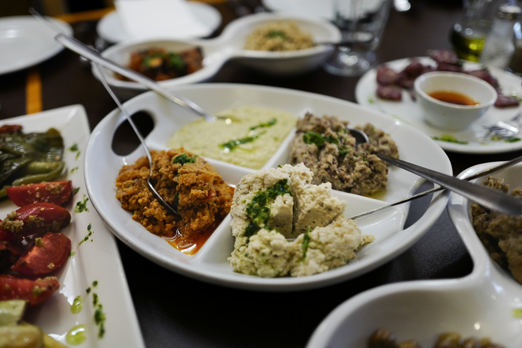 Vi får servert et bredt utvalg av fristende petut – småretter som grønnsaker, dipper, det lokale brødet med deilig, sprø skorpe, oliven lagt ned på honning og chili, ravioli, konfitert hanehals fylt med okse- og svinekjøtt.