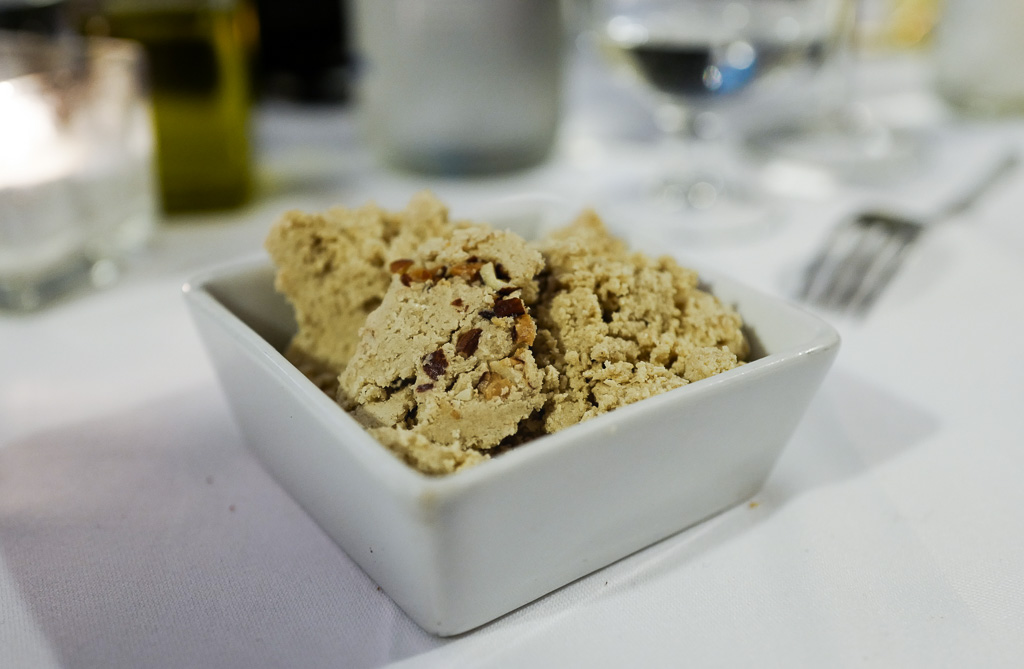 Også her får vi et utvalg paster før måltidet starter. Det kommer inn tre skåler. I den ene er det en paste laget på artisjokk, kapers og ansjos. Neste er en paste laget på soltørket tomat og hvite bønner. den tredje er en ganske klassisk hummus. Så godt!