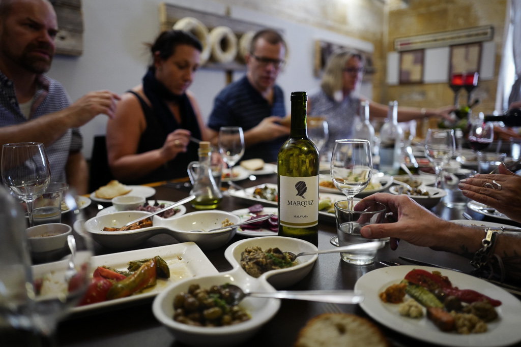 Maten er enkel, slik maltesisk mat er, og den smaker fantastisk. Vi får en nydelig fiskesuppe tilsatt anis og rotgrønnsaker, fiskekaker, lokale pølser i tomatsaus, siciliansk caponata, den kjente geitosten fra Gozo, ville vinsnegler i kjøttragu, pepper og masse laurbærblad, kremete blåskjell, fisk, blekksprut, grillet vaktel med jordbærsaus og cannelloni, orientalsk lam og couscoussalat.
