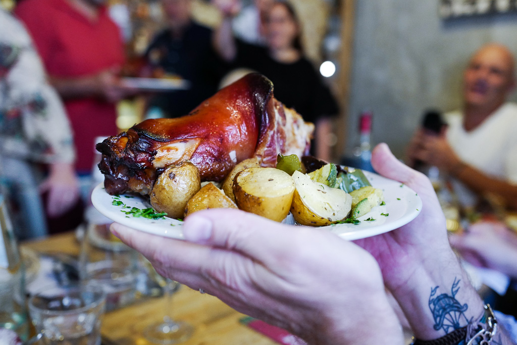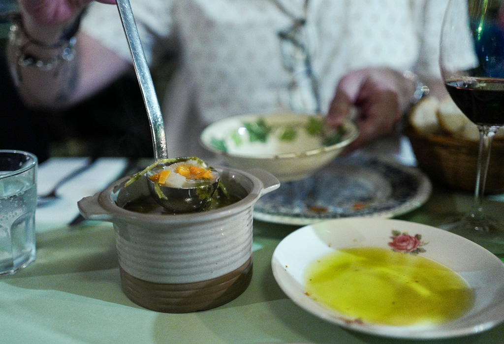 Vi får et utvalg av flere av restaurantens delikatesser som Enkesuppe, kjøttrullade med oliven og helstekt svineskank. I kjent stil serveres det et utvalg paste, oliven, bondebønner og geitost.