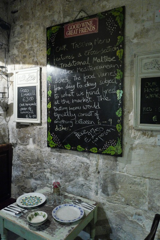 Legligin serverer tasting meny med det beste fra Malta. Vi betaler 27,50 euro per pers for en drøss med retter. Menyen settes ikke før samme dag. Først etter at kokken har sett hva han får tak i fra fiskebåtene eller fra grønnsaksmarkedet kan han lage menyen.