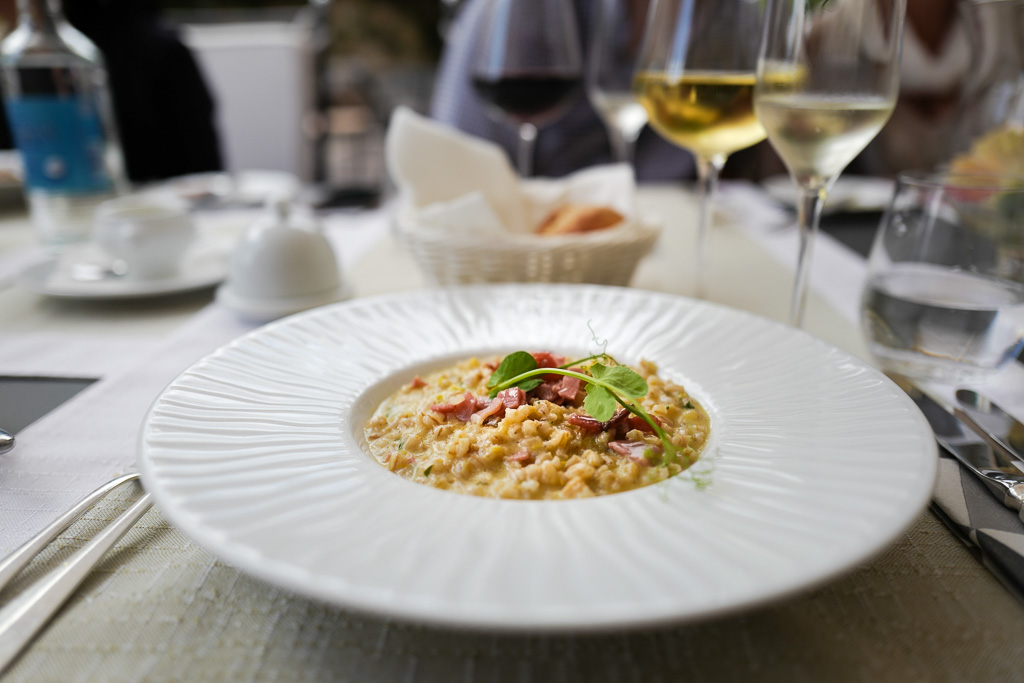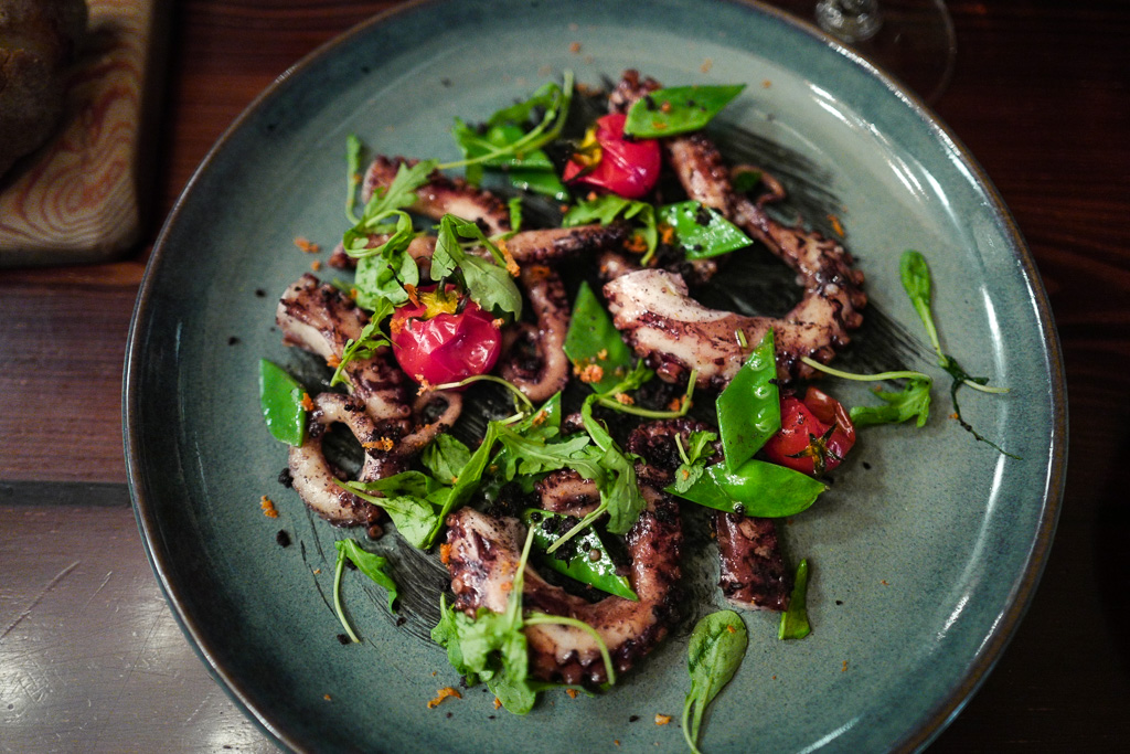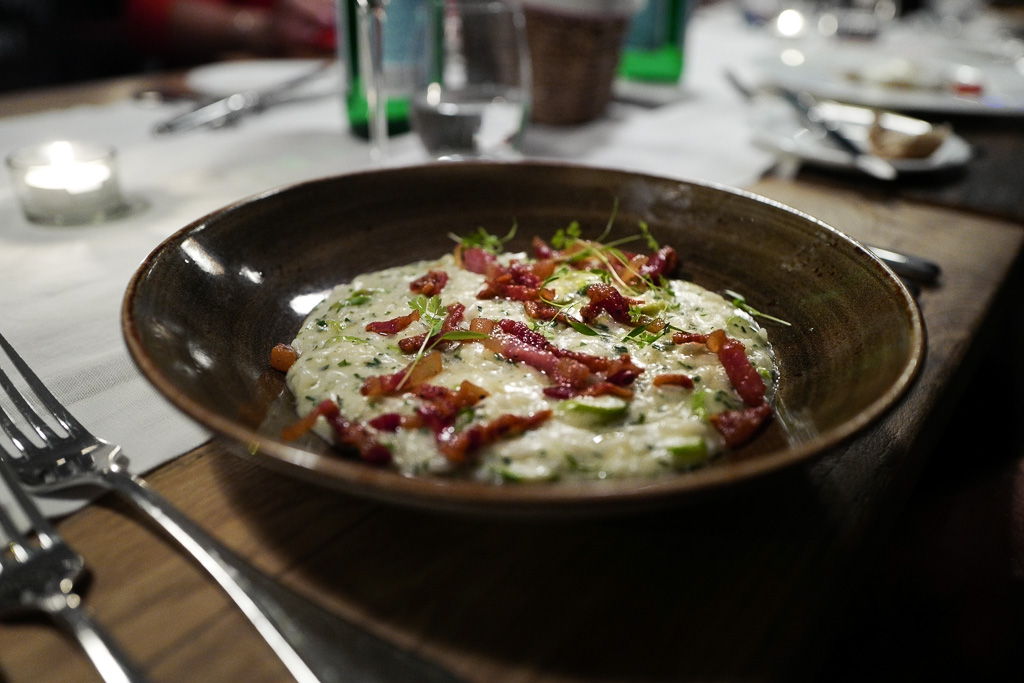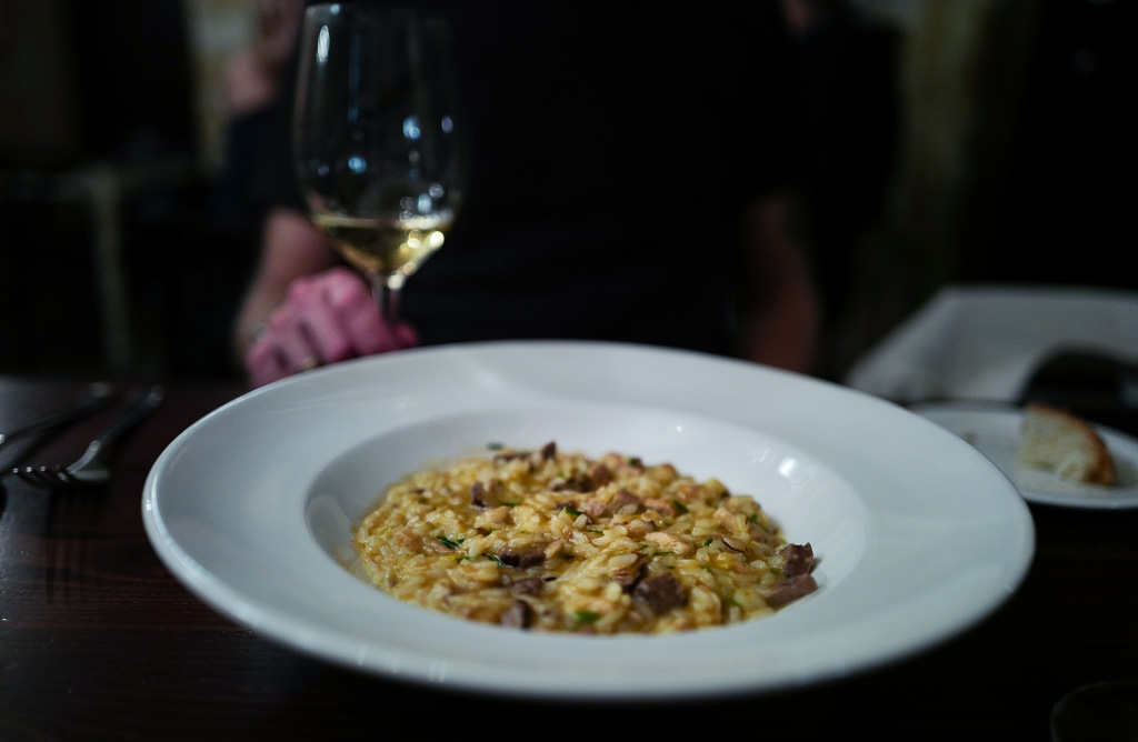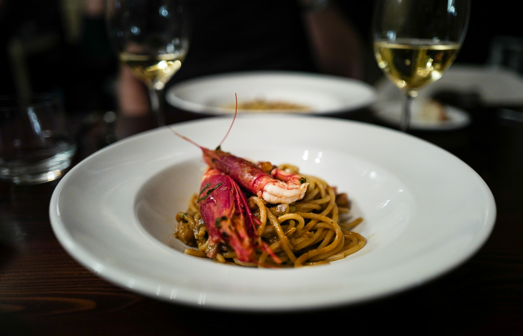 Jeg spiser en helt fantastisk blekksprutrett med tørket olivensmuler, blekk, chorizo, sukkererter, ruccola og tomat. Til hovedrett (som egentlig også var en forrett) spiste jeg en sjømat-spaghetti carbonara med reker, kråkebolle og guanciale (speket svinekinn). Den var helt ubeskrivelig god og viser ekte kokkekunst på høyt plan. Erik spiste Risotto Carnaroli med gresskar og revet gris.