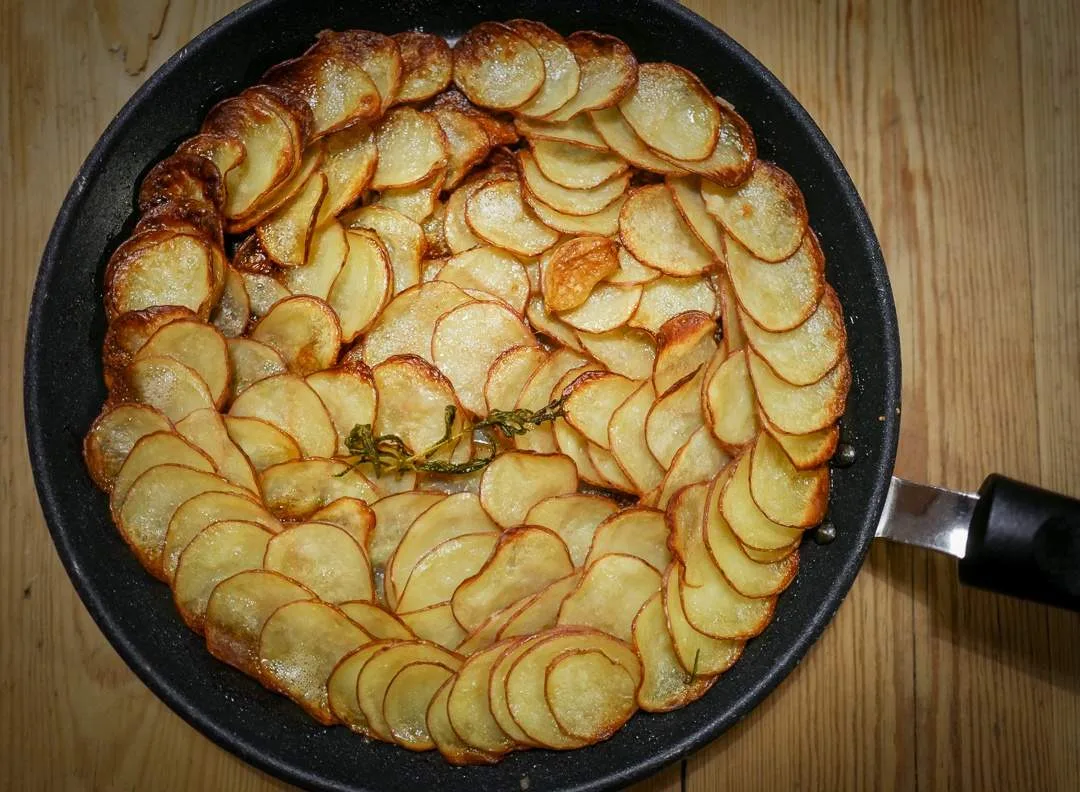 Legg disse i fint mønster i en teflonpanne. I en kjele smelter du 50 g godt smør og legger et hvitløksfedd og en kvist rosmarin i smøret. Når smøret er smeltet heller du det hele over potetene og setter på platen til medium pluss. Dryss litt flaksalt over. Etter noen minutter skrur du ned temperaturen til litt under medium og setter på et lok. La potetene steke i ca 15 minutter og sett så pannen inn i forvarmet ovn på 200 grader og stek slik at også overflaten blir gyllen og fin.