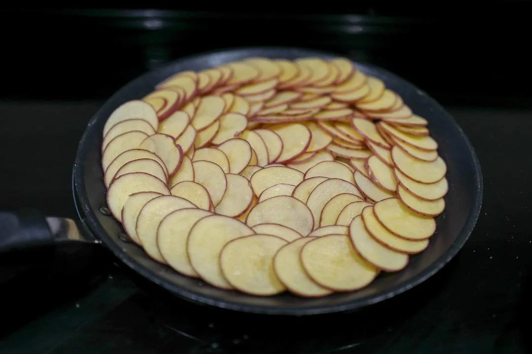 Hvordan lager jeg den? Superenkelt: Skjær tynne skiver av potet (med skallet på). Her er det lurt å bruke mandolin eller siden på et rivjern for å få tynne og jevne skiver.