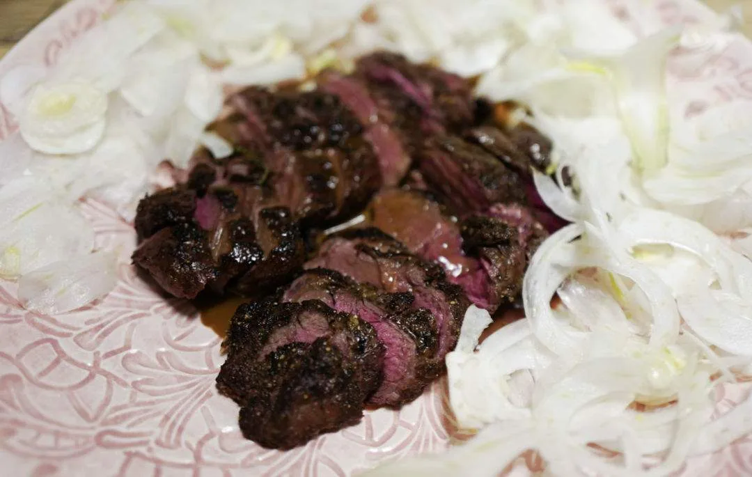 Kjøttet er grillet ferdig og har hvilt seg. Skjær det i skiver og hell litt av den deilige sausen over. Jeg høvlet fennikel og la det i isvann før servering og serverte til potetgaletten og kjøttet. Det ga den perfekte krønsjen som retten trengte.