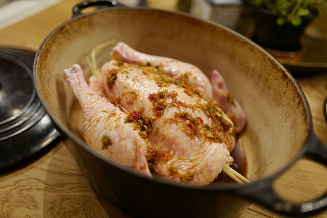 Tilsett pasten. La dette stå å trekke på medium varme i et kvarter. Sil blandingen og ha sausen over i en ren gryte. Restene smører du utover kyllingen. Stilkene fra sitrongresset legger du i buken på kyllingen.