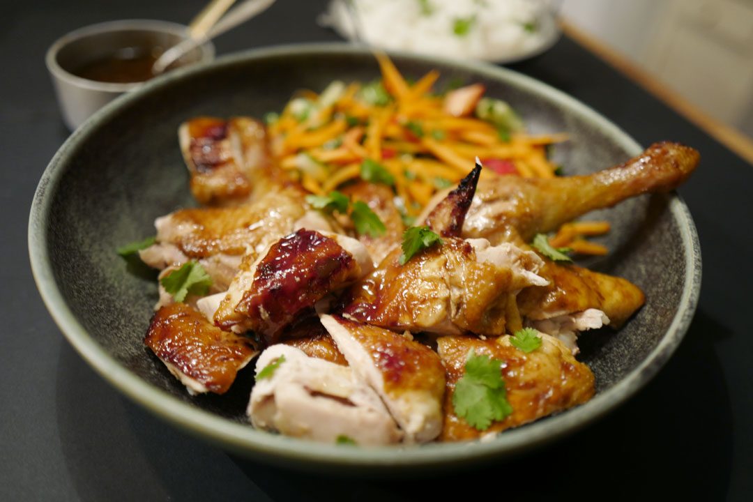 En stor kylling er enorme greier og er perfekt for fire personer. Jeg har laget en ovnstekt variant med masse sitrongress og en deilig karamellglaze med chili, ingefær og hvitløk. Jeg serverte den sammen med kokosris og en frisk salat med masse presset lime over. Det balanserer den aromatiske karamellglazen godt.