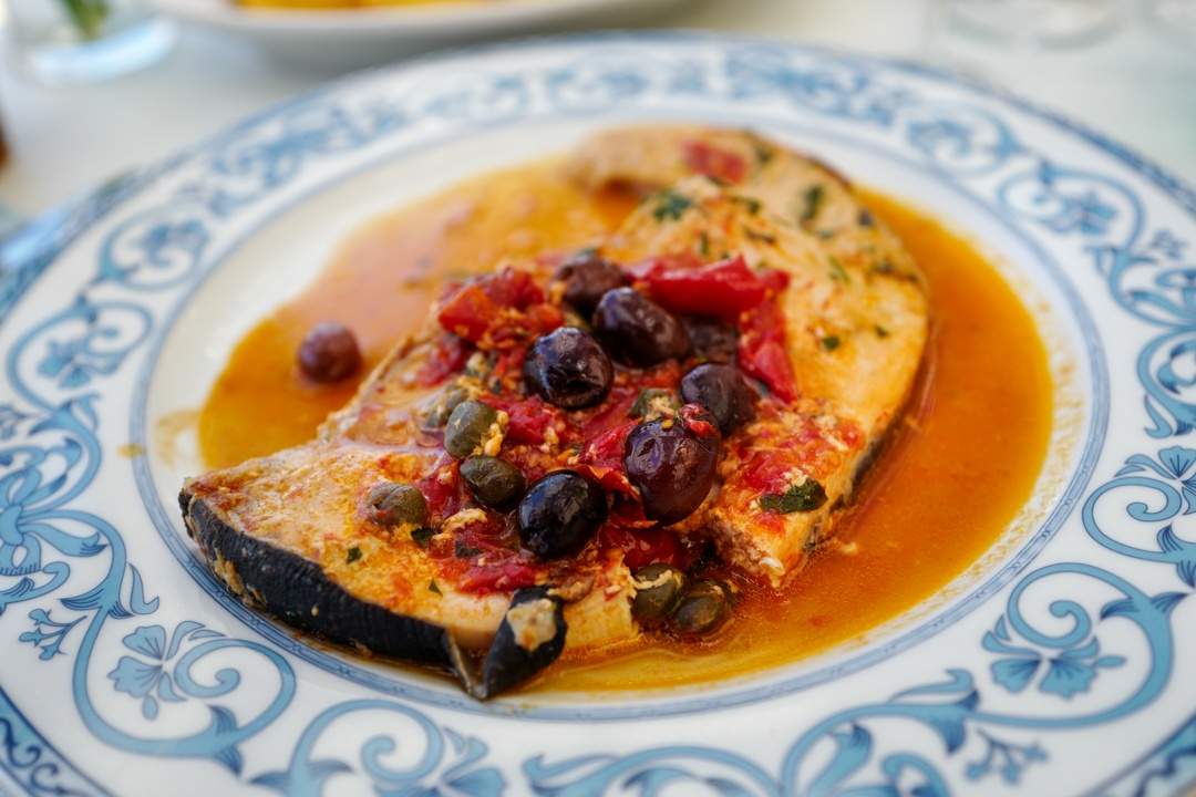 Carmine serverte et stykke sverdfisk med puttanesca på toppen.