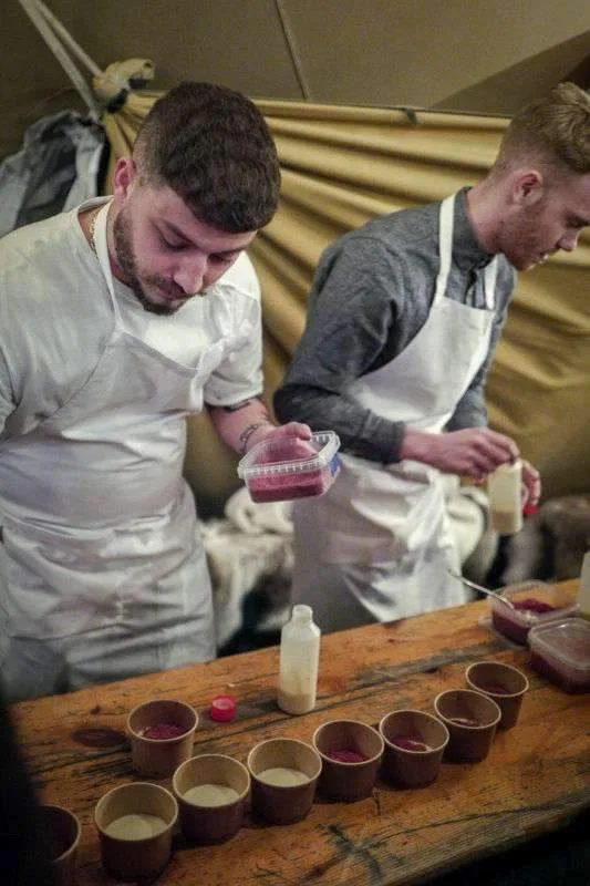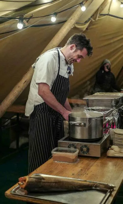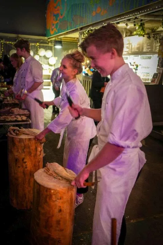 På de ulike matstasjonene fikk vi retter laget av noen av de beste restaurantene i Oslo: rømmegrøten med røkt reinsdyrhjerte og brunet smør fra Maaemo, potetlefse med reinsdyrtunge, tyttebær og løk fra Credo, Røkt hyse med eggesmør og potetmos fra Mangelsgården, blodpannekake med skarp ost fra Kontrast, pølse og erter fra IOM Indre Oslo Matforedling for å nevne noen.