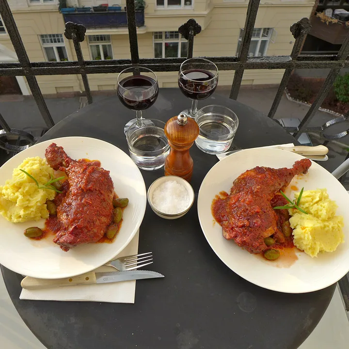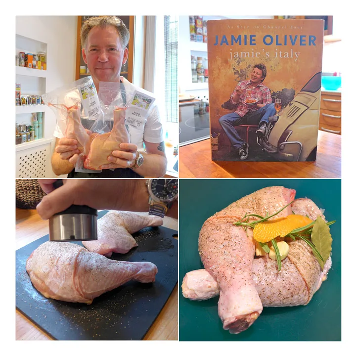 Salt og pepre lårene eller kyllingstykkene godt. Legg dem i en bolle med 3-4 laurbærblader (til to personer. ha opptil 6 blader til 5-6 personer), 2 knuste hvitløksfedd, en stilk rosmarin, en remse appelsinskall (dette var Eriks idé, noe som ga god smak til retten) og 2 dl rødvin. La dette stå en time på benken til marinering, eller over natten i kjøleskap.