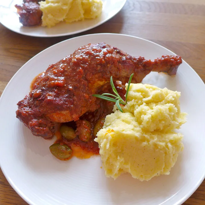 Etter marinering tørkes kylling av med litt papir. Strø mel over kyllingbitene og brun dem i en gryte med litt olivenolje. Hell over marinaden og alt som lå i marinaden, samt et par fedd hvitløk til, en boks knuste tomater og en stor neve gode olivener. Bruk gjerne grønne med sten i. Kok opp og sett gryten i ovnen på 180 grader i 1 1/2 time. Server med potetmos til.
