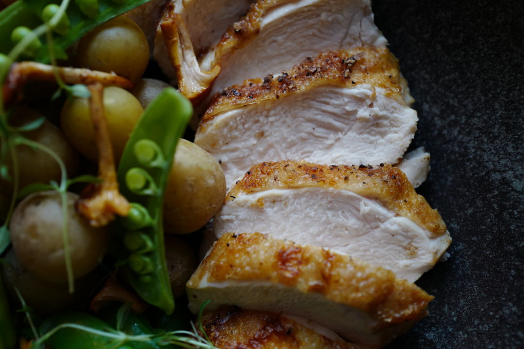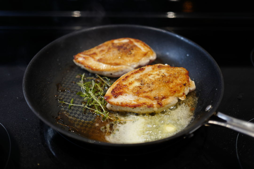 Jeg steker kyllingen på samme måte som andebryst: Først med skinnsiden ned i pannen. Forskjellen ligger i at jeg tilsetter smør og olivenolje i pannen når jeg steker kylling, for fettlaget i skinnet er magrere enn hos anda.