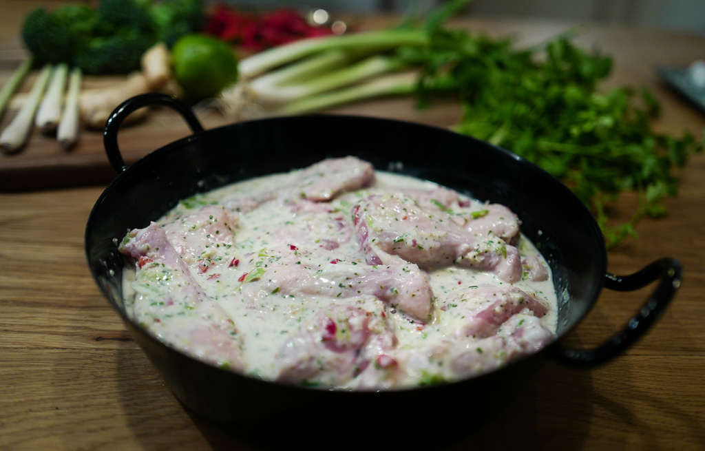 Vanligvis bruker jeg kokosmelk til en rett som denne. Den blander jeg med masse sukker, fiskesaus, ingefær, chili, hvitløk, koriander, sitrongress og vårløk. Problemet med kokosmelk er at den ikke tykner så mye som jeg ønsker. Den er vanskelig å smøre på kyllingen.