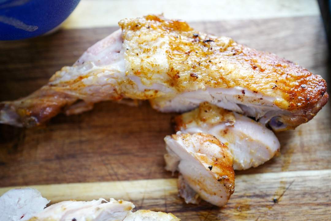 De må grilles indirekte med skinnsiden opp. Jeg drysset flaksalt og pepper på kyllingen og la den over på indirekte side av grillen i god avstand fra kullet. Lokket på grillen må på og så gjør den seg selv. Sørg for å ta kyllingbrystet av grillen når kjernetemperaturen er maks 66 grader. Det vil stige til 68 når kjøttet har fått hvilt seg. Og det må det. Gi det et solid 10-minutt før du skjærer det i skiver. Supersaftig kjøtt. Jeg garanterer deg dette.