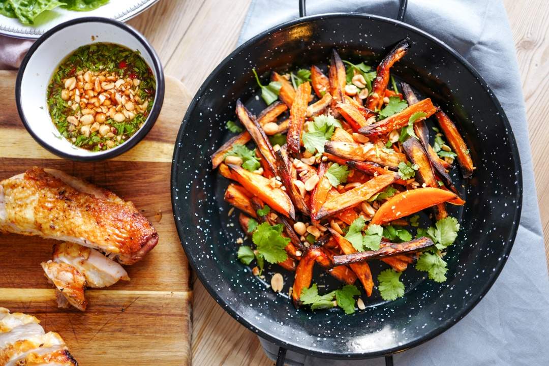 - Søtpotetene skrelles og deles i staver. Legg i en skål. Hell over olje og bland oljen godt med søtpoteten. Spre utover et bakebrett og stek på 200 grader til potetstavene er møre og gylne.